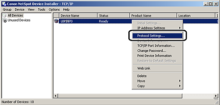 If the desired printer is displayed as a registered device in the device list4-B-1. Right-click the device shown above, then select [Protocol Settings] from the menu.