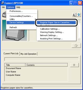 This printer's paper cassette cannot automatically detect the paper size. Therefore, you need to register the size of the loaded paper in the Printer Status Window.