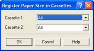When the message appears, and paper of the size specified in [Output Size] is to be printed, load the appropriate paper in the paper cassette and specify the appropriate paper size in the [Register Paper Size in Cassettes] dialog box.