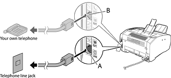 If you want to connect your own external telephone or telephone with built-in answering machine, connect it to external device jack (B) on the back side of machine.