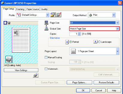 Leave the setting at [Match Page Size] if the page size specified for [Page Size] and the size of the paper loaded in the paper source are the same, because there is no need to change the setting in this case.