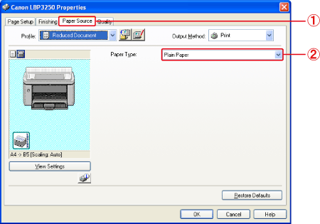 8. Display the [Paper Source] sheet (1), then select the type of the loaded paper in [Paper Type] (2).