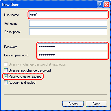 In the [New User] dialog box, check the user name in [User name] and password in [Password] and [Confirm password].