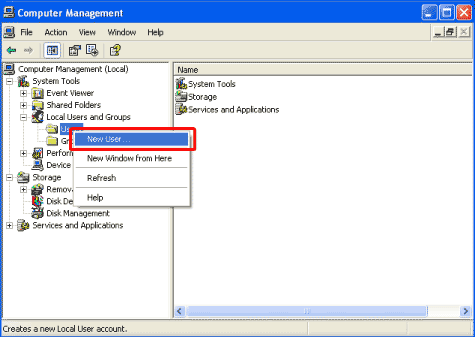 Under [System Tools], double-click [Local Users and Groups] -> right-click the [Users] folder -> click [New User].