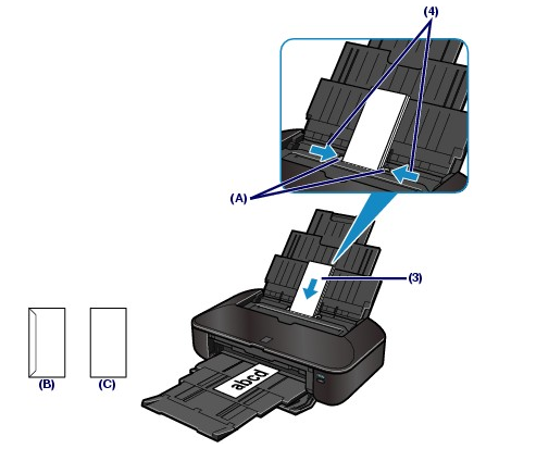 (3) Slide the Paper Guides (A) to open them, and load the envelopes in the center of the Rear Tray WITH THE ADDRESS SIDE FACING YOU.