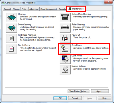 (2) Open "Properties" of the printer driver, then click [Auto Power] in the [Maintenance] tab.