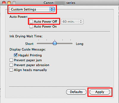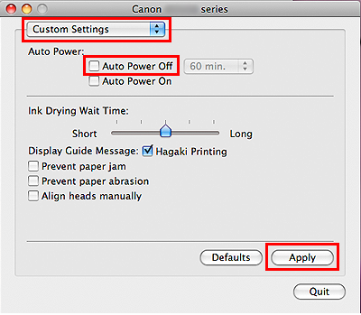 (3) Deselect [Auto Power Off] in [Custom Settings], then click [Apply].