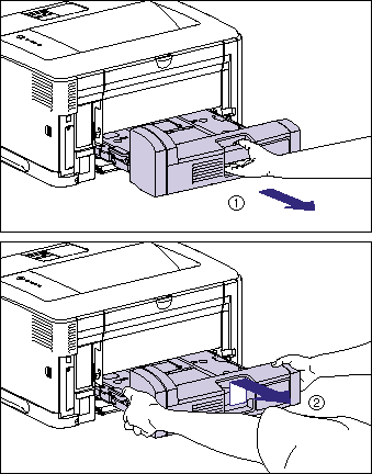 3. Pull out the duplex unit gently until it stops (1), then raise the front side of the duplex unit and remove it from the printer (2).