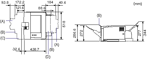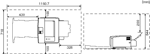 The dimensions of each part, foot positions, and the space required for using the printer with the duplex unit installed are indicated in the following figures:
