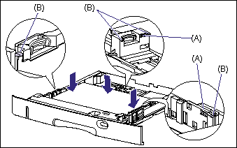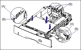 6. Hold down the paper as shown in the figure, make sure that the paper stack does not exceed the load limit marks (A), and then set it under the hooks (B) on the paper guides.