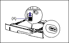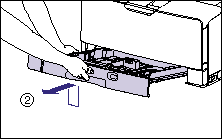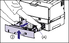 | Raise the front side of the paper cassette and remove it from the printer (2). | Hold the grips (A) with both hands, raise the front side of the paper cassette slightly (2), and then pull it out completely (3) as shown in the figure. |