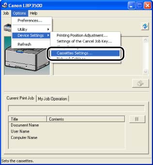 11. From the [Options] menu in the Printer Status Window, select [Device Settings] -> [Cassettes Settings].