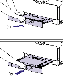 9. Set the paper cassette in the printer at an angle as shown in the figure (1), then push it into the printer or the paper feeder gently and horizontally (2).