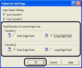 12. Specify the paper feed direction (the loading orientation) of the custom size paper loaded in the paper cassette in [Feed Direction of Custom Paper Size] in the [Cassettes Settings] dialog box, and then click [OK].