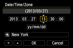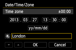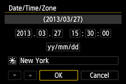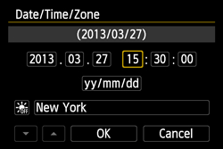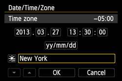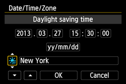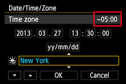 When you turn on the power for the first time or if the date/time/zone have been reset, the date/time/zone setting screen will appear. Follow the steps below to set the time zone first. If you set the camera to the correct time zone for where you currently live, when you travel to another time zone you can simply set the camera to the correct time zone for your destination to update the camera’s date/time automatically.