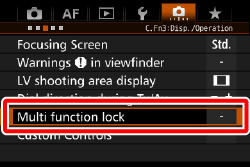 > switch is set to the right and you try to use one of the locked camera controls, <L> will be displayed in the viewfinder and on the LCD panel. On the shooting settings display, [LOCK] will be displayed. - If you lock, the <