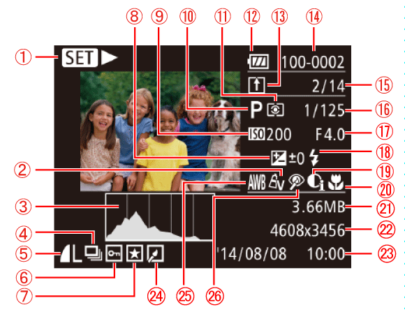 ![]() | Shooting mode | ![]() | Shooting date/time |