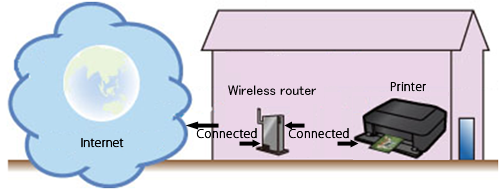 The printer connects to a wireless router which is itself connected to the Internet, as shown in the diagram.