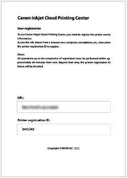 (9) Follow the instructions displayed in the window, and print the URL of the authentication site and the Printer registration ID