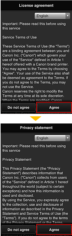 (2) In the License agreement and Privacy statement windows of Canon Inkjet Cloud Printing Center, read the statements, and select [ Agree ] if you agree.